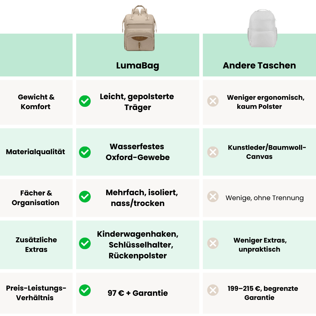 Warum Hunderte für separates Babyzubehör ausgeben, wenn die LumaBag alles in einem bietet? Sie bekommen Komfort, Alltagstauglichkeit und clevere Organisation – und das für nur einen Bruchteil der üblichen Kosten.